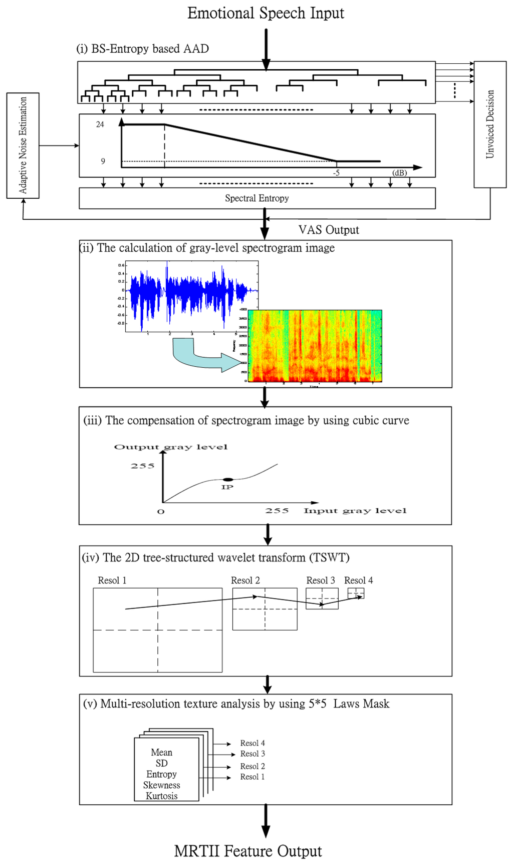 Figure 1 shows a diagram of the proposed MRTII-based feature extraction algorithm including BS-entropy based AAD and the multi-resolution texture analysis. In the step 1 of Figure 1, the emotional speech is inputted into BS-entropy based AAD. We can find that the voice-activity segment (VAS) is outputted. In step 2, the calculation of gray-level spectrogram image is determined. In step 3: we can compensate the spectrogram image by using cubic curve. Next, through the 2D tree-structured wavelet transform (TSWT), we can complete the multi-resolution analysis for the desired frequency channel. Finally, the multi-resolution texture analysis by using 5 × 5 Laws mask will be done. The details will be addressed in the following subsections.