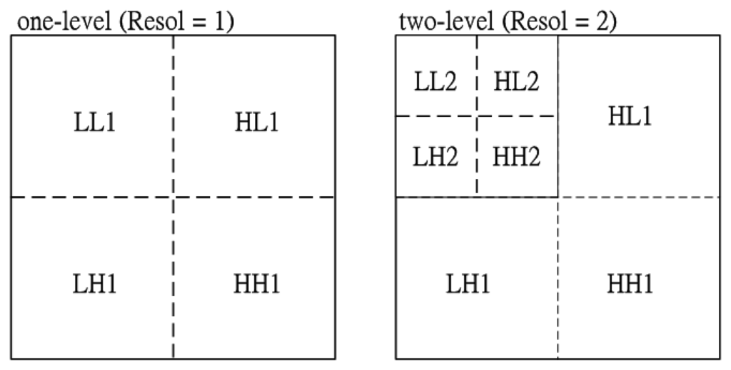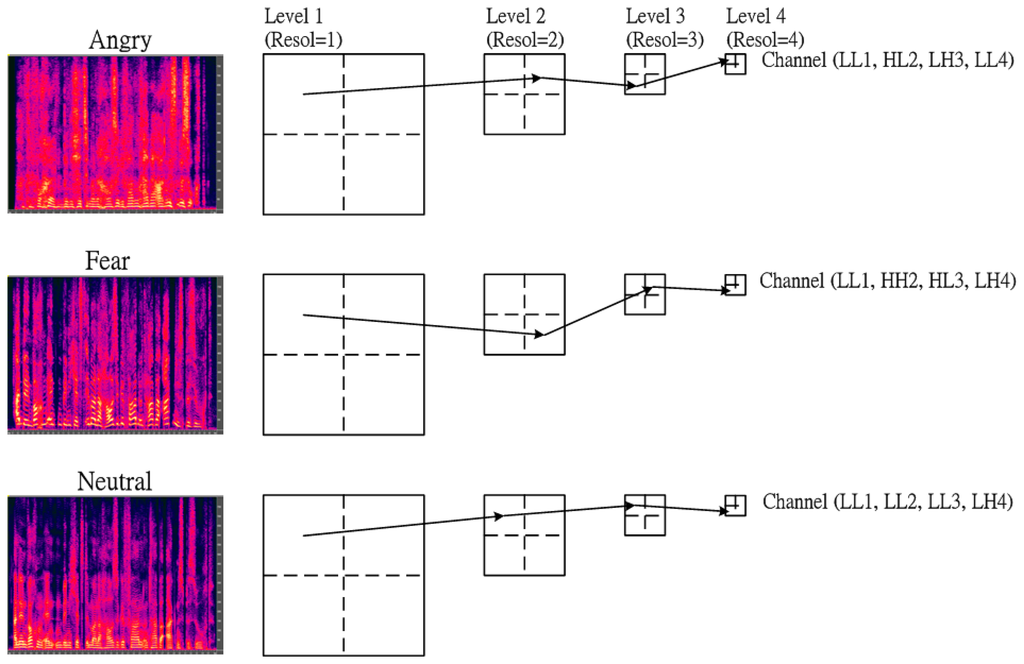 In this section, multi-resolution texture analysis plays an important role in the 2-D spectrogram image for speech emotional classification. Therefore, a 2-D discrete wavelet transform (DWT) is utilized for spectrogram image decomposition. The image is actually decomposed into four sub-bands and critically sub-sampled by applying DWT as shown in Figure 2a.
