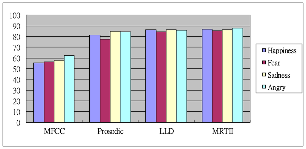 For the mixed database, the accuracy rate of the “Anger” emotion with MRTII is better (86.19%) than for other emotion states. In contrast, the accuracy rate of the “Happiness” emotion with the MFCC features is the lowest (48.84%) among all test data. It is found that the proposed MRTII feature can provide high accuracy when SER performs cross-corpora. In the average results of emotional classification among the four databases, the MRTII features outperformed the MFCC, Prosodic and LLD features, while the overall performance of the MFCC features was worse than for Prosodic, LLD and MRTII. The APCA achieved good accuracy (86.64%) for the MRTII features when compared to the average accuracy ranging from 58.01% to 85.80% provided by the MFCC, Prosodic and LLD features, respectively. This is due to the fact that different emotions can distribute different levels of frequency. A possible explanation is that the MRTII can easily describe the distributed frequency channel by TSWT (as shown in Table 1) to discriminate the differences between each emotion while comparing with other features. Since there are no distinct salient words used for the “Sadness” and “Fear” emotional states, the recognition performance is lower than for other emotional states. Conversely, the sentences with “Anger” emotion are often comprised of intense words. Therefore, it can achieve the best performance. In addition, the recognition recognitions using different feature extractions are also summarized in Figure 4. The results demonstrate that the proposed MRTII-based feature extraction combined with BS-Entropy-based AAD can achieve better recognition accuracy than others.