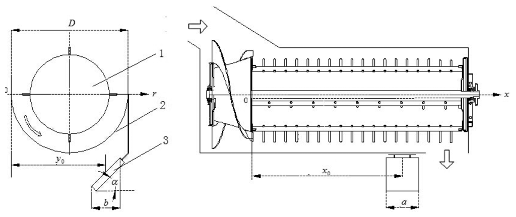 To apply a mathematical model for monitoring grain separation losses, experiments were performed in the laboratory on a longitudinal-axial threshing-separating-cleaning test-bed with tangential feeding [27]. The diameter of the tangential rotor was 590 mm, and its length was 1025 mm. The threshing component of an axial drum with trapezoidal teeth. The diameter of the longitudinal-flow threshing rotor was 500 mm, and its length was 3390 mm, where the length of the separation section L = 1950 mm. A schematic diagram of the test-device is illustrated in Figure 3.