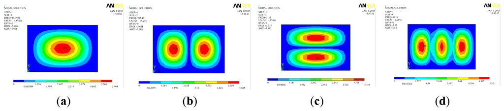 If c1 ≫ c, then we get ζ′ ≫ ζ, from Equation (24) and it can be seen that the dynamic magnification coefficient A (g) was significantly decreased, so that the harmonic vibration can be rapidly decayed. A constrained damping layer which is based on shear deformation of the viscoelastic material between the substrates consumes vibration energy. The location of the constrained damping layer has a greatly effect on structural vibration attenuation. The vibration damping effect was limited when the constrained damping layer is applied in a small deformation place, so the constrained damping layer should cover the place with larger structural deformation, which would achieve a better vibration damping effect, as well as result in a small increase of the total weight of the sensor. It was known that vibration modes of the sensitive plate determined on condition of h, a, b and material of the sensitive plate were fixed. To obtain the relative deformation rate of the plate, modal analysis utilizing Shell 63 element as calculation unit was carried out with the ANSYS software. Relevant research has indicated that low-level vibration has a larger effect on the dynamic performance of the structure, so we selected the first four orders of vibration modes and the calculated results are shown in Figure 11.