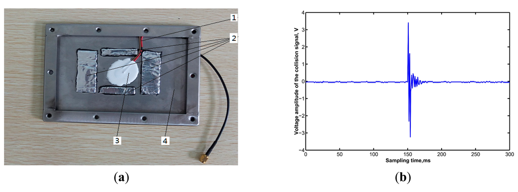 Piezoelectric ceramic is one of the most widely used sensing materials, and has a high sensitivity to the corresponding changes and could respond to a minimum microvibration, making it especially suited for measuring dynamic changes with a relatively lower cost [29]. By pasting a piezoelectric ceramic in the centre of sensitive plate, grain collision experiments were conducted when four sides of the sensitive plate were fixed, and the corresponding grain collision signal waveforms are shown in Figure 5c. From Figure 5c we could see that the voltage amplitude of the output signal was almost always above 4 V and the overall sensitivity was higher, but the attenuation time was so long that the detection speed could not keep up with the demand. Taking the grain collision signal characteristics, cost, and sensor working circumstances into consideration, we selected YT-5L piezoelectric ceramics as sensing element, a grain impact piezoelectric sensor was designed and structure optimization carried out to improve the detection speed of the sensor.