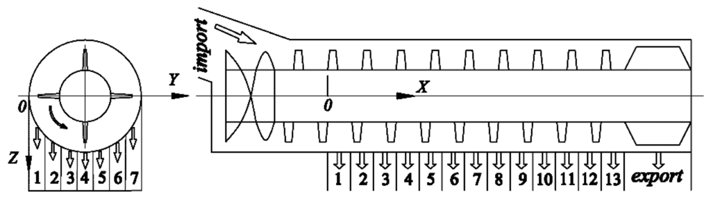 Miu and Kutzbach have developed a universal mathematical model for grain threshing and separation for a threshing unit [24,25]. On the basis of the previous research works, we extended the mathematical model to be also valid for longitudinal-flow threshing units [26]. Supposing the length of the separation section in a longitudinal-flow rotor was L (mm), we set the point above the first receiving box on a longitudinal-flow rotor as the origin of coordinates in an established coordinate system, as shown in Figure 2. The variable x was the current position associated with the threshing length.