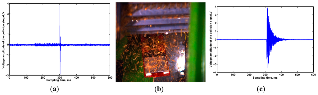 From Table 2, we can see that as the quantity fed increases, the grain flow rate in the monitoring area increases gradually. The maximum grain flow rate was up to 120 grains per second, which means that the attenuation time of the collision signal should be less than 8 ms. As seen from the grain collision original signal waveform shown in Figure 5c, the attenuation time was so long that the detection speed of the sensor could not be guaranteed. Therefore, to accommodate the required speed in a huge range, we must take some actions to accelerate the detection speed.