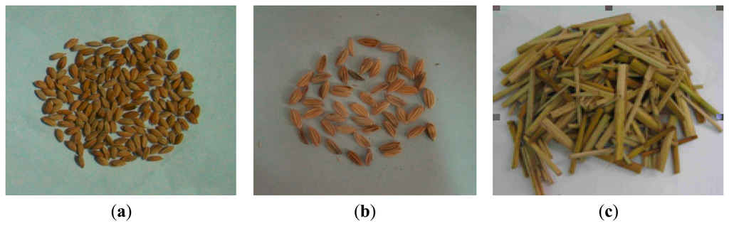 The surface of a sensor usually consists of a rigid plane, which discriminates loss grains from MOG based on differences in grain impact force and force rise-time. Since differences in collision force and force rise-time would lead to differences in signal frequency and voltage amplitude, understanding the characteristics of grain collision signal was a decisive step for designing a grain impact sensor. The material ingredients were more complex at the location of the sensor, and besides grain particles (the grain radius ratio general was 1–3 (Xu et al. [30]), there were also MOG (mainly composed of long grass (100–300 mm in length), short straw (30–90 mm in length), as well as some light debris), which have a similar physical properties as grains and also have a paramount influence on monitoring accuracy. Pictures of grains and MOG are shown in Figure 6.
