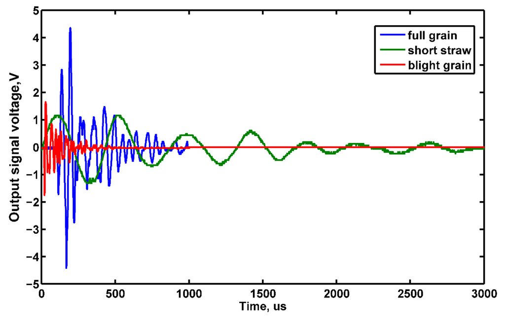 Since the horizontal velocity of the material was about zero, the variations of maximum signal voltage Vout and rise time tr were mainly controlled by the rice shape, orientation and straw length. From Figure 7, it was found that there were distinct differences in Vout and tr among rice grains, short grains and blighted grains when they impact with the sensitive plate. For rice grains, the maximum Vout was nearly about 4.5 V with tr of 25 μs; for short straw, the maximum Vout was nearly about 1.4 V with tr of 100 μs; and for blighted grain, the maximum Vout was nearly about 1.7 V with tr of 12 μs.