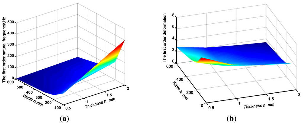 From Equations (14) and (18), it is shown that the natural frequencies and vibration modes of the sensitive plate mainly depend on h, a and b under the condition that E, ρ and μ are fixed. Therefore, selection of the sensitive plate geometry was a key technology for improving the performance of the sensor. Relevant research indicated that low levels of vibration had a larger effect on the dynamic performance of the structure: the higher of the first-order natural frequency, the quicker the vibration system could reach a steady-state status; the larger the vibration displacement, the greater the deformation of the piezoelectric element that occurred was, and a greater amount of charge would be generated, so the sensor sensitivity was also higher. To obtain variations of the first-order natural frequency and relative deformation rate under different structural forms, modal analysis was carried out though ANSYS software (ANSYS, Inc., Canonsburg, PA, USA, 2011). In modal analysis, we utilized the Shell 63 element as the calculation unit, and sensitive plate material was 304 stainless steel with μ = 0.3, E = 210 GPa, and ρ = 7,850 kg/m3, a = 120 mm, b = 100 mm, 200 mm, 300 mm and 600 mm, h = 0.5 mm, 1.0 mm, 1.5 m m and 2.0 mm; the calculated results are shown in Figure 8.
