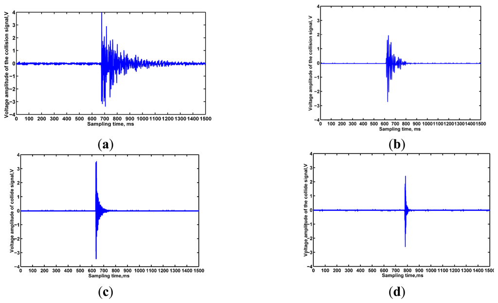 To verify the ANSYS software simulation results and analyze the influence of structure on detection performance intuitive contrast grain collision experiments were performed in the laboratory. The experimental process was the same as the method mentioned above and the resulting impact signals using four dipfferent structures are shown in Figure 9. Figure 9 shows that, when the sensitive plate width b = 400 mm, the first-order natural frequency of the sensitive plate was increased as the thickness h increased from 0.5 mm to 2.0 m,, while the relative deformation rate monotonously decreased. Accordingly, the collision signal attenuation time and voltage amplitude both decreased. Similarly, when the sensitive plate length b = 200 mm, the first-order natural frequency of the sensitive plate increased and tended to a constant range, while the relative deformation rate monotonously decreased with increases of thickness h from 1.0 mm to 2.0 mm. The collision signal attenuation time has a rare decline and the voltage amplitude is decreased to a large extent, which would affect the sensitivity of the sensor. Further grain collision experiments results verified that the experimental results were basically consistent with the theoretical analysis results. The higher the first natural frequency, the shorter the signal attenuation time was; the higher the relative deformation rate, the higher the sensor's overall sensitivity. Taking the monitoring area, sensor performance under different structures, and economy as considerations, a sensitive plate with length a = 120 mm, width b = 180 mm, thickness h = 1.0 mm was selected as the optimal structure.