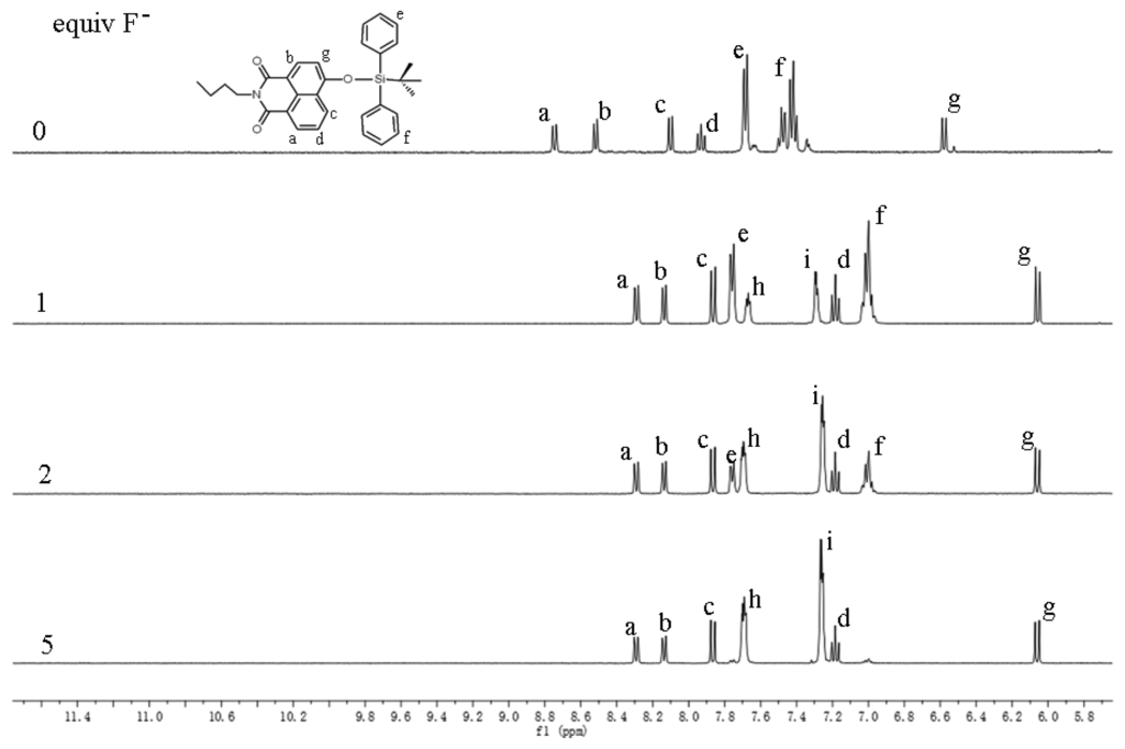 To understand the mechanism of the interaction between Z2 and F−, NMR titration was carried out (Figure 1). Addition of F− ion resulted in the proton peaks of the naphthalimides moiety (“a–d” and “g”) upfield shifting, and the proton peaks “e” and “f”, which belonged to the TBDPS moiety, decreasing and disappeared at last. Meanwhile two new proton peaks (“h” and “i”) reflected the by-product TBDPSF appeared and elevated along with the increased concentrations of F−. This result indicated the reaction of Z2 and F− proceeded with the proposed mechanism in Scheme 1, which was in accordance with that presented in a previous paper [40].