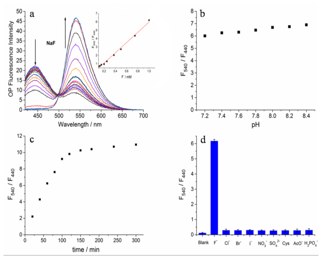 The photophysical properties of Z2 were studied systematically in HEPES buffer (20 mM, pH 7.4) containing 30% DMSO (v/v). The UV-Vis absorption spectrum and fluorescence excitation spectrum of Z2 were examined first (Figure S4). Under these conditions, Z2 exhibited a strong response toward F−. Upon adding F−, the absorption maxima at 365 nm decreased and a new band at 456 nm appeared (Figure S5). In the fluorescence measurements a new fluorescence maxima at 540 nm increased along with the disappearance of the fluorescence emission peak at 440 nm (Figure 2a). Moreover, a good linear relationship of F540/F450 (regression factor, R = 0.9858) with the concentration of F− (0.1–1.0 mM) was observed (Figure 2a inset). The fluorescence emission could achieve stability in 150 min after adding F− (Figure 2c). In addition, Z2 showed negligible fluorescence responses toward pH changes (Figure 2b), which demonstrated Z2 was insensitive to biologically relevant pH values. In order to evaluate the selectivity of Z2 toward F−, the ions of Cl−, Br−, I−, NO3−, SO42−, H2PO4−, AcO− and cysteine (Cys) (1 mM each) were added separately. Only F− induced unique fluorescence changes, and the others did not cause any fluorescence emission change (Figure 2d). Therefore, Z2 was highly selective for F− and could be employed to monitor F− without interference from the other analytes mentioned above. The results were similar with those in a just published paper, in which the authors used different synthesis conditions to get the same product. They studied only OP fluorescence properties and the recognition capacity in 90% DMSO solution [43].