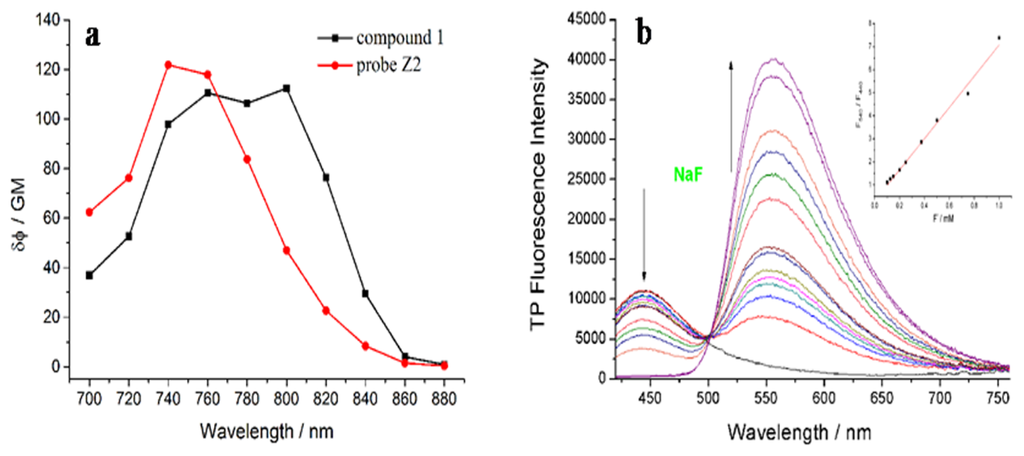 The TP absorption cross-section intensity of Z2 and 1 were evaluated, respectively. As shown in Figure 3a, the maximum TP action cross section value of Z2 was 121 GM at around 720 nm, and 112 GM at 800 nm after adding F−. Furthermore, the dose-dependent ratio F540/F440 of Z2 displayed a good linearity for F− (regression factor, R = 0.9878) with the concentration (0.1–1.0 mM), which predicted the probe could be used to detect F− quantitatively by TP excitation (Figure 3b).