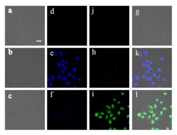 To demonstrate the ability of Z2 to image F− in live cells, HeLa cells were used as the model cells. After cells incubated with Z2 (10 μM) for 20 min, bright blue fluorescence could be observed inside cells (Figure 4e) upon excitation at 780 nm. After 15 μM of NaF was added to the above cells, strong green fluorescence appeared (Figure 4i). The distinct changes of fluorescence responses clearly indicated that Z2 was capable of ratiometric fluorescence imaging of F− in living cells.