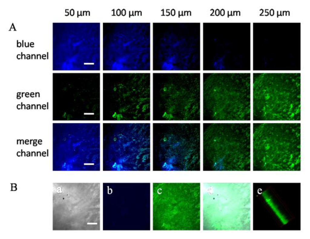 Next, we investigated the utility of Z2 in deep tissue imaging. TPM images were obtained from a part of a tumor tissue slice. The Z-scanning confocal imaging revealed that bright TP fluorescence emission was still present at 250 μm of penetration depth and no auto-fluorescence signal existed. The TPM images at depths of 50, 100, 150, 200, and 250 μm showed the F− distribution in each XY plane.