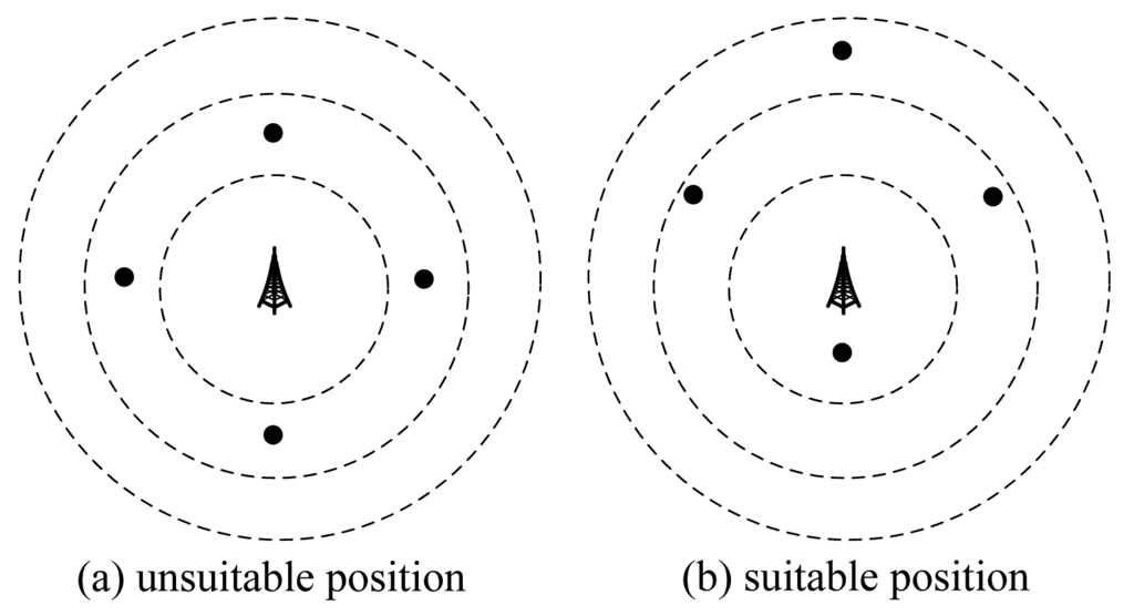 Based on Theorem 1, we can draw concentric disks around the base station. Nodes in the same concentric ring cannot transmit simultaneously. For example, consider a WSN with four nodes, as shown in Figure 1. In Figure 1a, the position of B is not a good position, because all nodes are in the same concentric ring, so these nodes cannot transmit together. While in Figure 1b, three of them can transmit together. Therefore, the position of B in Figure 1b is better than that in Figure 1a. Based on this example, we will design an algorithm in the next section.