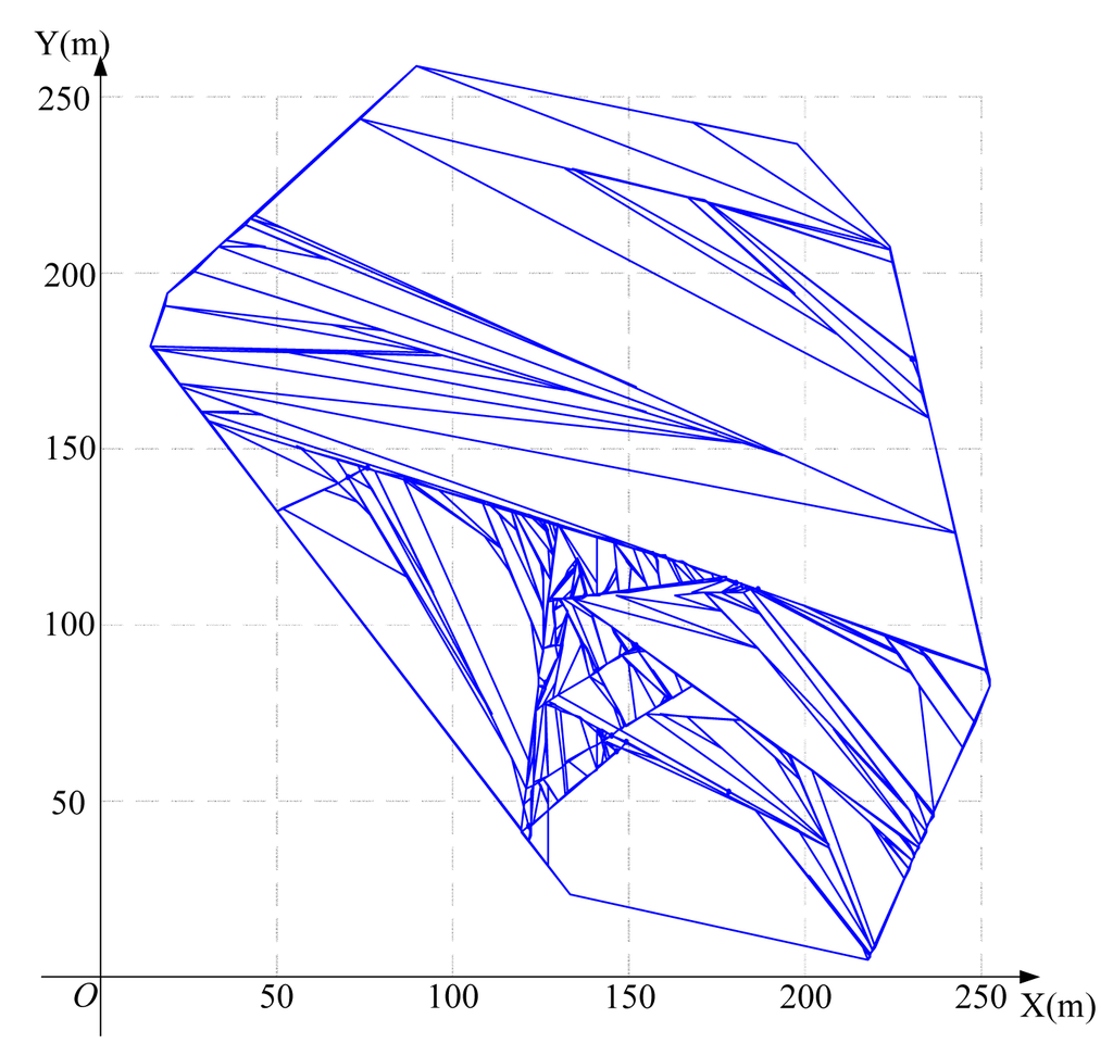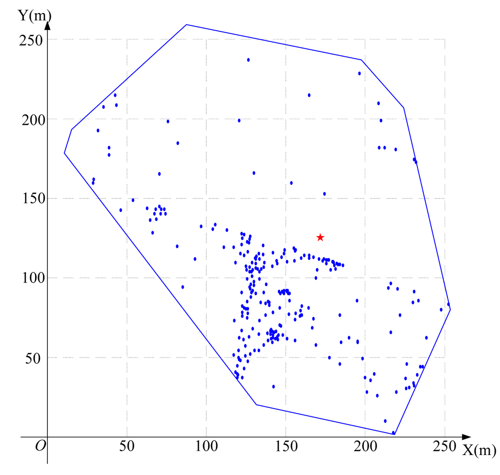 Using the algorithm in Figure 3 to find the feasible region for base station placement, the vertex coordinates of the feasible region are (223.3,207.4), (197.4,236.3), (252.1,83.7), (14.4,179.6), (133.0,25.0), (89.6,258.2) (19.1,193.9) and (217.7,6.8), as shown in Figure 8. Then, using the LMID algorithm, we divide the feasible region into 262 pieces, as shown in Figure 9. The center points of these pieces are shown in Figure 10. We then calculate the K value for the case that the base station is placed at each of these center points. We find that the maximum value of K is 23.151 when the coordinate of B is (171.9,127.8). We compare the performance with and without base station placement, where the second case can be solved by the algorithm in [25] and the base station is fixed at the center of the region (i.e., (125,125)). When the base station is placed at the center of the region, the K value is 16.592 with SIC and 4.119 without SIC. They are both less than that with base station placement.
