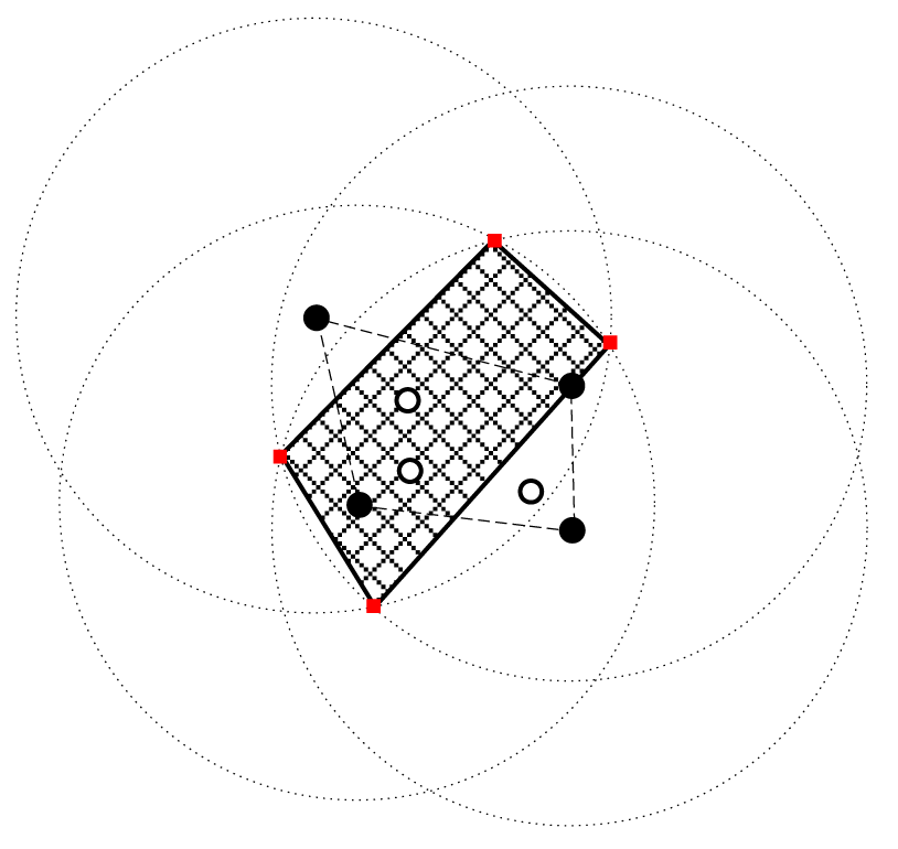 Figure 4 is a simple example for the algorithm in Figure 3. There are seven nodes in the network. Among them, the four black nodes are the vertices of the convex closure, while the three white nodes are inside the convex closure. Therefore, we only need to consider four black nodes to determine a feasible region. We obtain the four red nodes as the vertices of the feasible region.