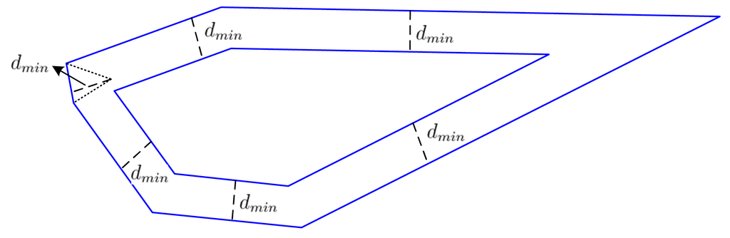 We have one distance for each edge in Step A. Find the minimum distance dmin among these distances. Delete this edge by coalescing its two endpoints into one point located at the common point of bisection. Then, shrink the polygon by moving all of the remaining edges into the polygon's interior by dmin. Since the edge corresponding to dmin is reduced to a point, the number of edges of the new polygon is reduced by at least one. Figure 6 is an example of a six-edge polygon shrinking into a five-edge polygon.
