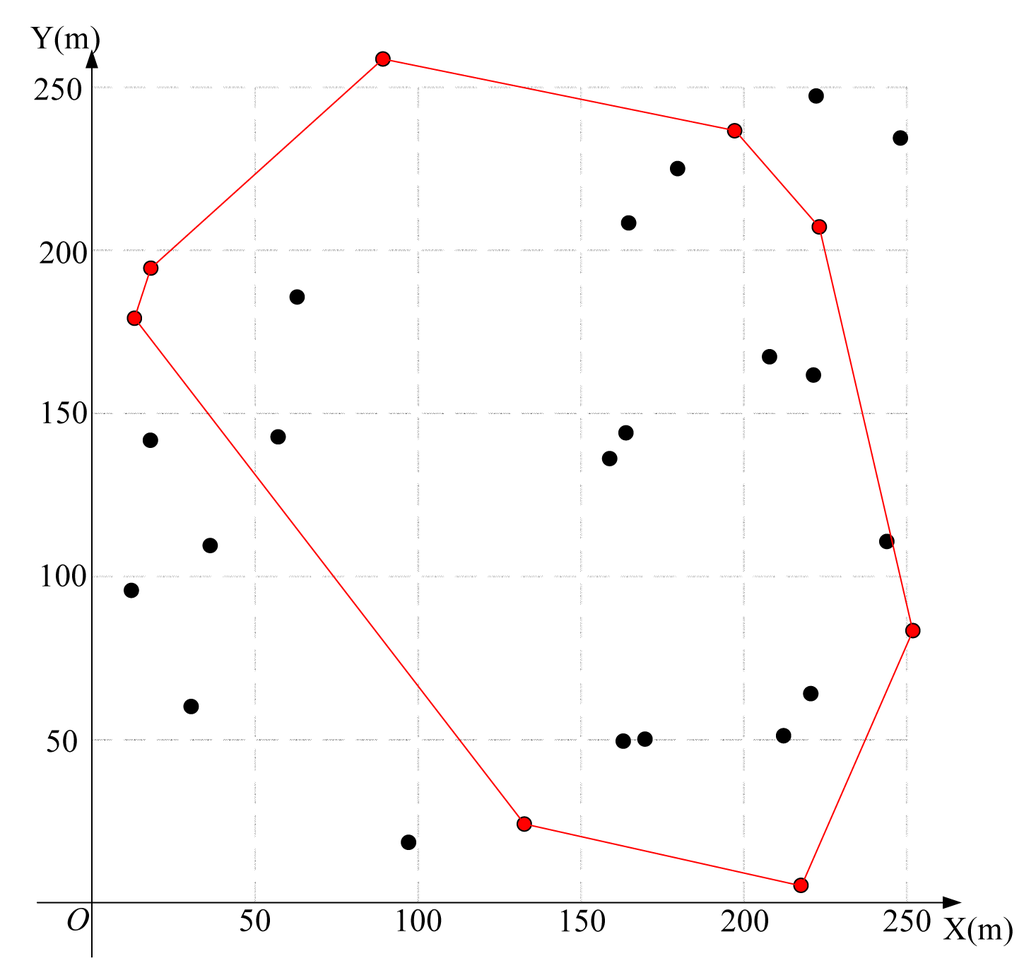 - Graham, R.L. An efficient algorithm for determining the convex hull of a finite planar set. Inf. Process. Lett. 1972, 1, 132–133. [Google Scholar]