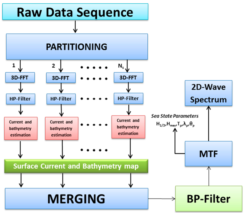 The strategy employed to retrieve the sea state from nautical radar data typically involves the processing of a temporal sequence of Nt partially overlapping consecutive radar images. Starting from the 3D spectrum of the radar sequence and by going through a number of operations to take into account the physical processes and to filter out the distortions [22], it is possible to extract the wave spectrum and the hydrodynamic parameters, as well as the surface currents and the bathymetry.