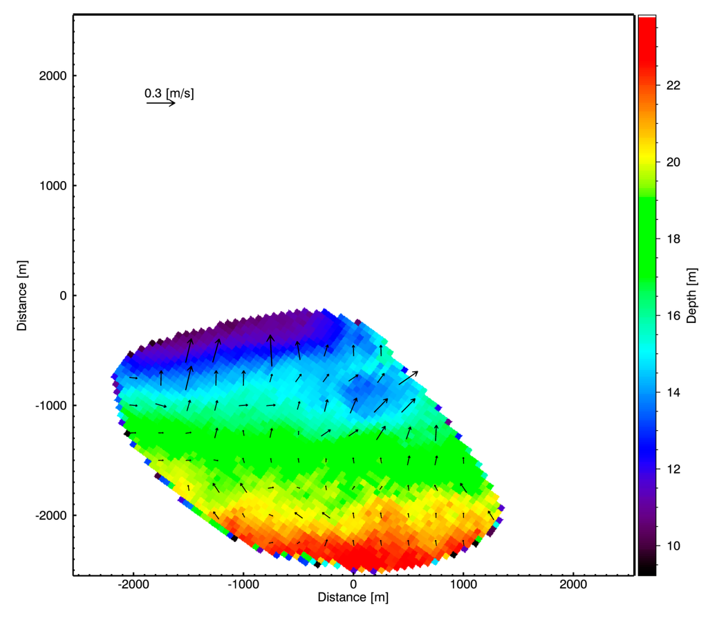 As stated earlier, the NSP method provides [7] a joint estimation procedure for both the bathymetry and the surface currents. In the particular case considered here a very low surface current field has been estimated with a mean value equal to 0.1 m/s, a maximum of about 0.3 m/s, and a standard deviation of about 0.06 m/s. No field measurements were unfortunately available. Figure 10 depicts the bathymetry map reconstructed with a spatial resolution of 50 m and an overlapping surface current vector map on a 255 × 255 grid for better visualization spatial resolution of 255 m.