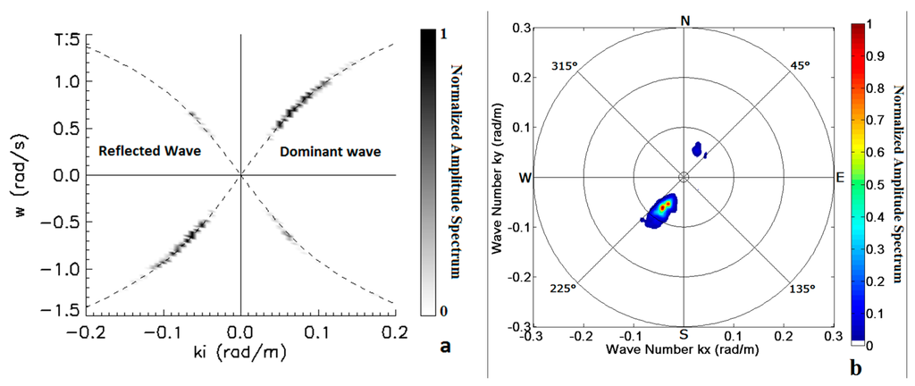 The required sea-wave spectrum Fw(k̄, ω) can be obtained from the filtered image spectrum F̃I(k̄, ω) by resorting to the radar Modulation Transfer Function (MTF), which mitigates the distortions affecting the radar echoes and caused by both the acquisition geometry (e.g., shadowing and tilt modulation) and the electromagnetic (e.g., the Bragg) scattering mechanisms [13,22–24]. For this purpose, we use the MTF described in [22]. For the scope of this work, however, the reconstruction of the wave field is only required to establish the presence of reflected waves, as it will be shown in the following section.