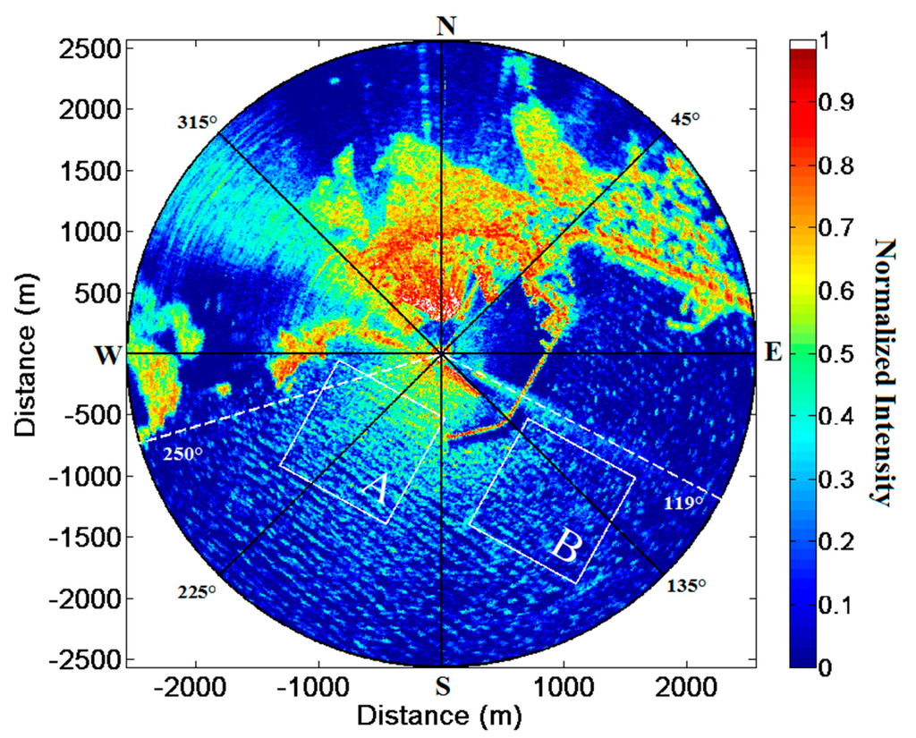 The radar system was connected to the Remocean system [22], which incorporates an analog-to-digital (AD) converter for the received signal. The radar images were stored using a 13-bit unsigned integer format, on a 1024 × 1024 pixels Cartesian grid. During the measurement campaign, the nautical radar acquired a total of 832 consecutive images, each with a pixel spacing of 5.0 m in both coordinates.
