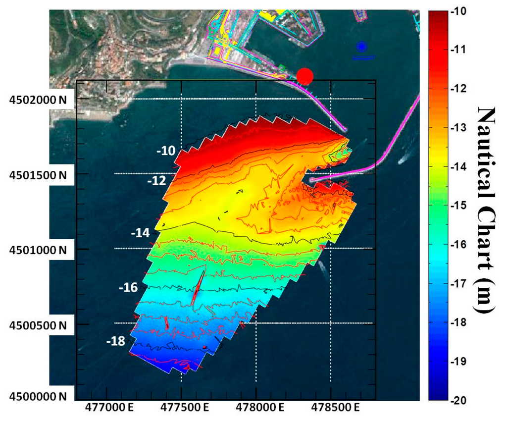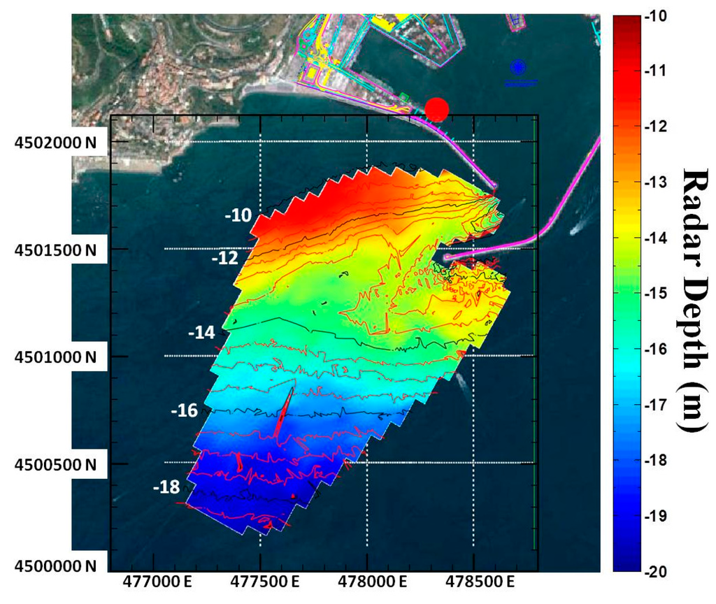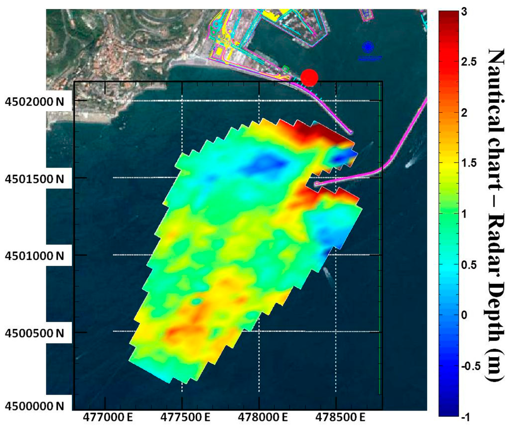 The retrieved mean bathymetry field has been compared with a nautical chart obtained by a survey performed by the Port Authority, on February 2011 with a single beam ElacHydrostar 4300 echo-sounder integrated with a GPS Leica System 1200. All the measurements are referred, as usual, to the lowest values of the astronomic tide (about −0.20 m with respect to the sea mean level). The nautical chart and the radar derived bathymetry have been reported to the same grid by using a Delaunay triangulation procedure (Figure 6). In these pictures (as in Figure 4) the red and the black lines represent the iso-depth levels of the nautical chart with depth steps of 0.5 m and 2 m respectively.