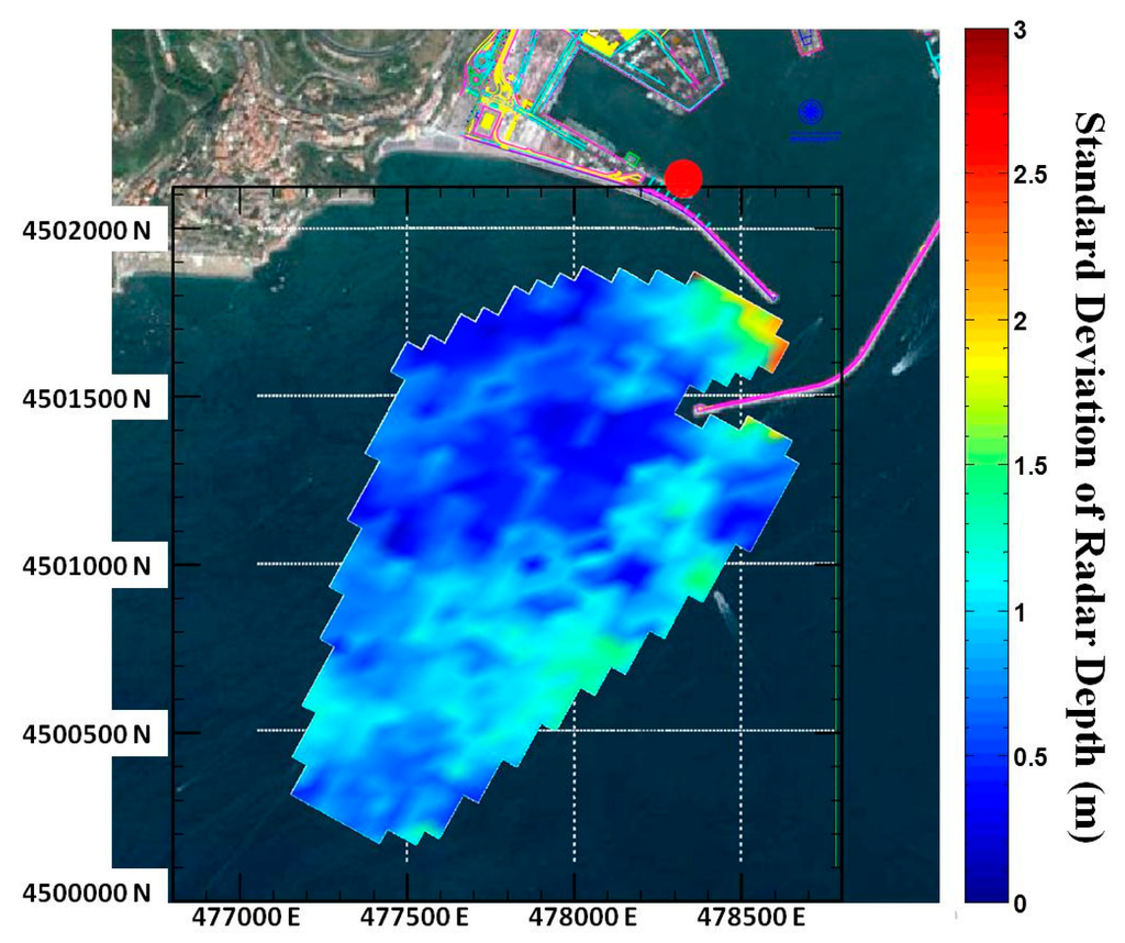 The bathymetry map is shown in Figure 4, while Figure 5 shows the local standard deviation as computed among the successive bathymetry estimates in time; its value is relatively low everywhere except in the vicinity of the seawalls and in particular at the harbour's entrance where, as expected, the low wave height and the presence of the jetties affect the accuracy of the results. Almost everywhere else the standard deviation is lower than 1 m, thus confirming the stability of the retrieval method.