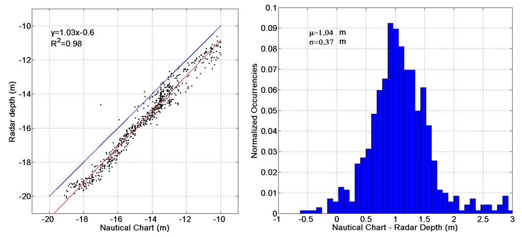 A further possible explanation for this systematic error can be found on the limits of the linear wave theory, upon which all the radar sea surface analyses are based. According to [16,21] the assumption of linear waves leads to an over-estimation of the water depth, and specially so in shallow water. This is indeed an aspect which needs to be clarified in further work, but the results obtained can be surely considered promising.