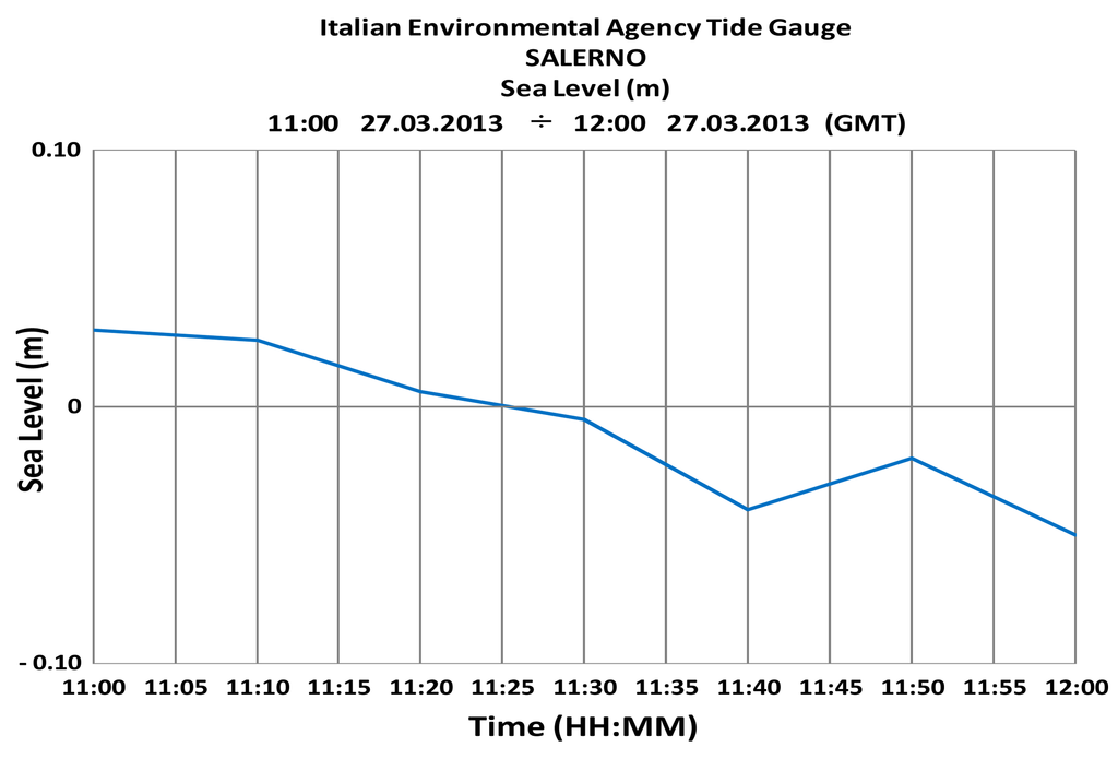 The correlation coefficient (R2 = 0.98) between the radar depth and the nautical chart is very high and the error between the radar estimates and the ground truth is very low (the standard deviation is about 0.37 m); however, a strong bias of about 1 m can be also observed. Part of this difference can be explained by the effect of tides; in order to do so, the records of the Italian Environmental Agency tide gauge, located within the harbour itself, were examined (Figure 9), and it was found that at the time of experiments the water height was at about the mean sea level (msl); since the sounding is referred to the standard datum, i.e., to the average low tide level, which is about 0.20 m under the msl, at least about one fifth of the bias can be accounted for.