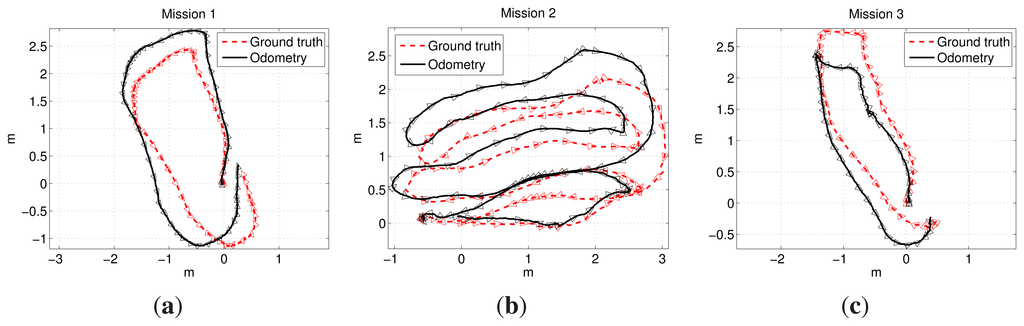 The missions already described in Section 4.2.1 were also used to carry out the quantitative analysis: a loop, a sweeping trajectory and a loop over a non-flat terrain. Both ground truth and visual odometry have been shown in Figure 11. In the three cases, a significant odometric error appears.