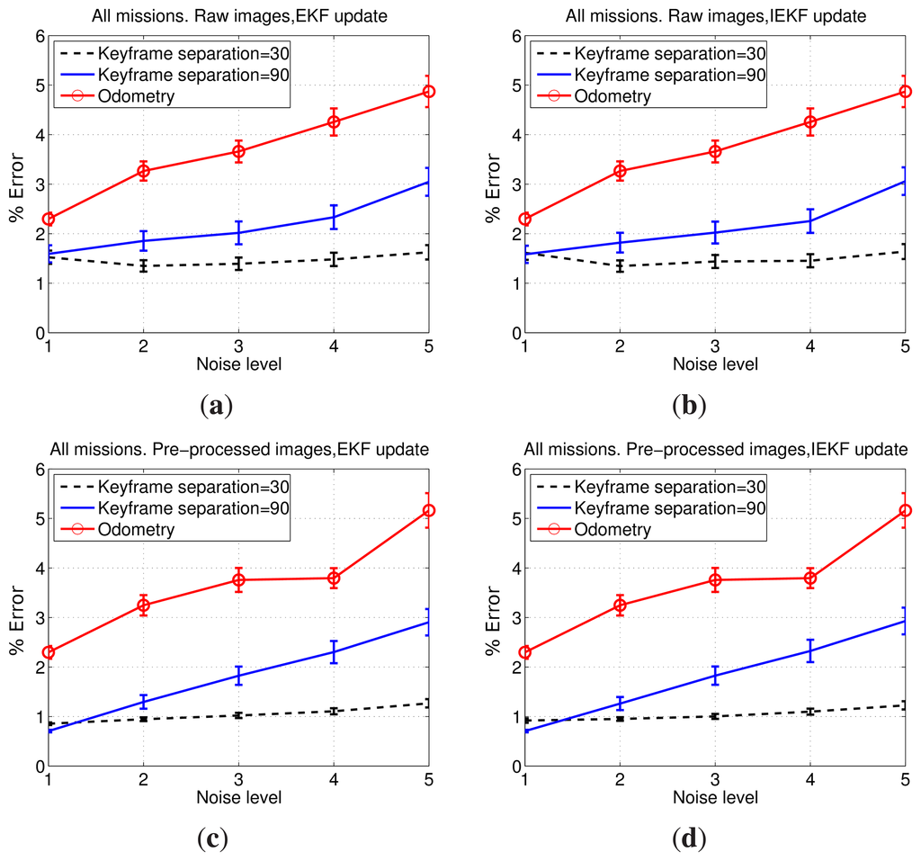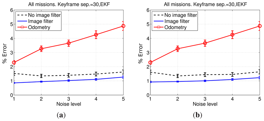 Figure 13 compares explicitly the errors obtained using raw images and filtered images combined with EKF and IEKF updates. It can be observed that filtering the images actually provides a significant improvement in terms of error reduction with respect to the results obtained using raw images.