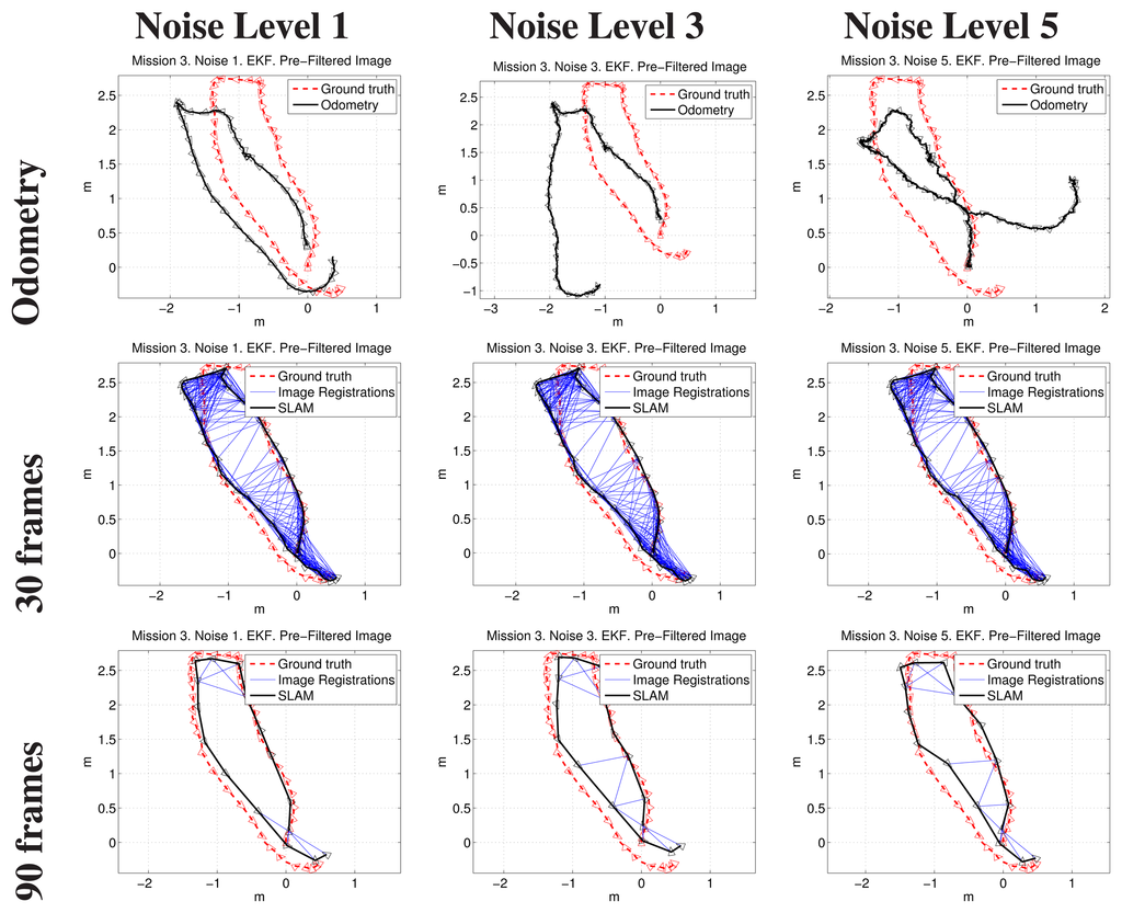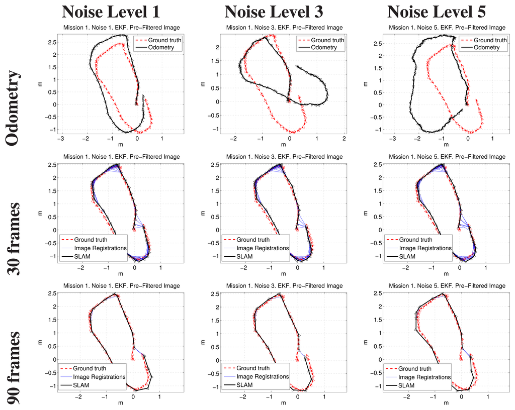 In addition, for each filter update, image treatment and keyframe separation, the visual odometry was corrupted with five different levels of additive zero mean Gaussian error. The covariance of this noise ranged from [Σx, Σy, Σθ] = [0,0,0] (Noise Level 1) to [Σx, Σy, Σθ] = [4 × 10−5,4 × 10−5,5 × 10−4] in Noise Level 5. For each of these cases, 50 trials were executed. This leads to a total of 9000 trials.