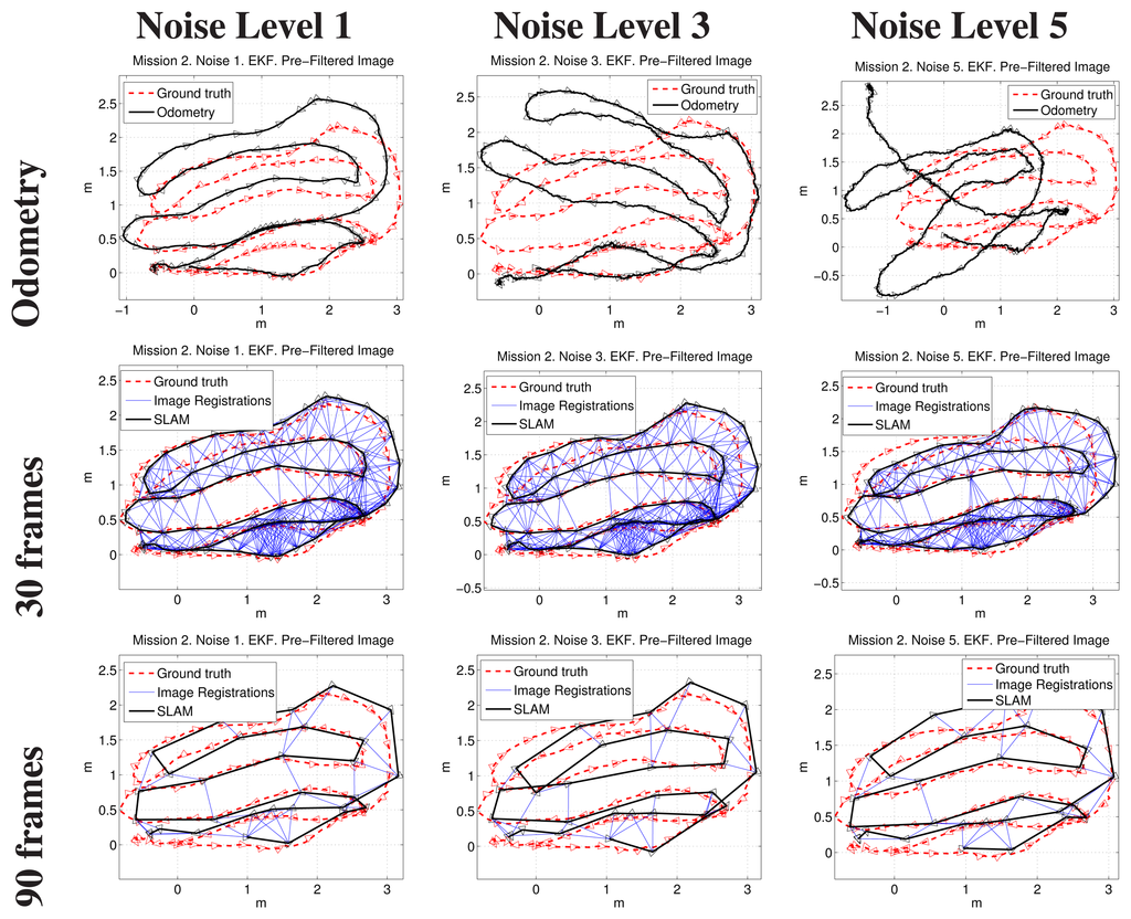 Figures 14, 15 and 16 show some representative examples of the SLAM operation under different conditions for the three missions. In all cases, the EKF update and the filtered images were used.
