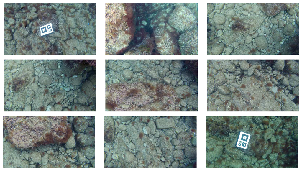 A final experiment was conducted in real undersea conditions, in Port de Valldemossa (Mallorca, Spain). Being a real environment, the floor was non-flat, fully covered by stones and algae, and the robot, which navigated at an approximately constant depth, was influenced by small currents and waves. Furthermore, some minor flickering and shadows appeared in some of the images. Figure 17 shows some examples of the imagery gathered during this experiment. It is worth emphasizing that since the relief of the ground was much lower than the height at which the robot was moving, the system still provided highly plausible results.