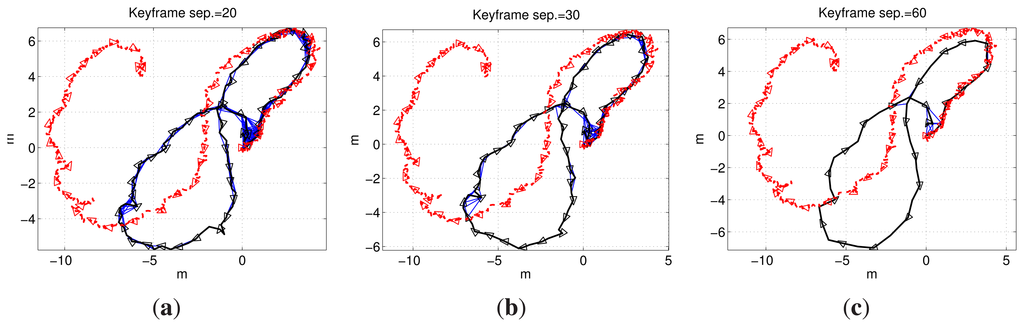 Figure 18 shows the results obtained using a keyframe separation of 20, 30 and 60 frames. All of the plots show the positive image registrations in blue, the trajectory computed from the visual odometry in red and the SLAM trajectory in black. Notice how loop closings are found not only in the origin-end of the trajectory, but also along it. Again, the robot is represented as a triangle, with one of its vertices pointing towards the direction of motion.