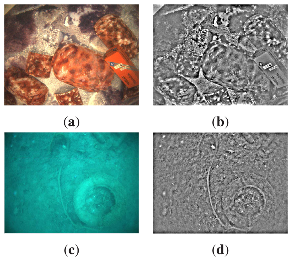 As an example, Figure 2a,c shows the underwater images gathered by our robot, whilst Figure 2b,d shows the same images after applying the aforementioned filter. As can be observed, image regions with high intensity changes are enhanced and mainly correspond to actual objects in the scene.