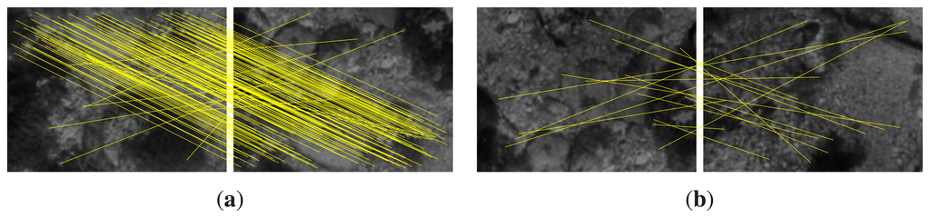 Finally, features of both images under comparison are matched using the SIFT matcher. At this point, the obtained correspondences could be used to compute the 2D motion between the two feature sets. However, the problems due to directly using feature matching are magnified in these kind of scenarios with which we deal. As an example, Figure 3a shows two images of the same environment where the second one is shifted vertically with respect to the first one. It can be observed that, although most of the SIFT feature matchings, shown as yellow lines, seem to properly capture the motion, some of them do not. If the relative motion between the images is computed using this information, the wrong correspondences would introduce some error in the estimate. Figure 3b shows another example in which the two images correspond to completely different areas that do not overlap. However, SIFT wrongly finds some correspondences. In both cases, the wrong correspondences are said to be outliers, whilst the correct ones constitute the inliers.