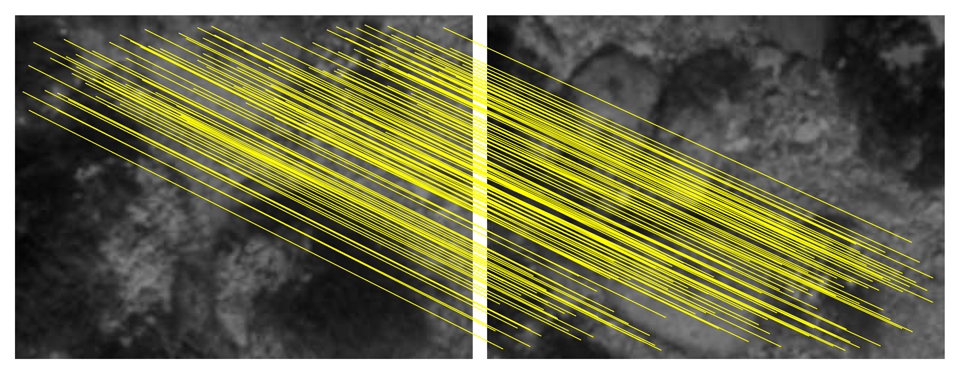 As an example, Figure 4 shows the feature correspondences after applying our proposal to the images previously shown in Figure 3a. It can be seen how the wrong correspondences have been rejected and only those explaining the true motion remain. Our proposal has also been applied to the images in Figure 3b, determining correctly that they do no overlap.