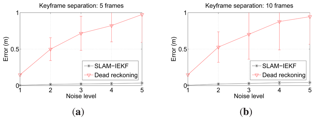 The results obtained when using a keyframe separation of five are shown in Figure 7a, and those obtained using a keyframe separation of 10 are depicted in Figure 7b. It can be observed that the SLAM error is significantly below the error in dead reckoning. It is clear that the differences due to the keyframe separation and the noise level are very small. Thus, these experiments suggest that our proposal leads to pose estimates whose quality is nearly unrelated to the dead reckoning noise and to the keyframe separation, as long as the overlap between consecutive keyframes is sufficient.