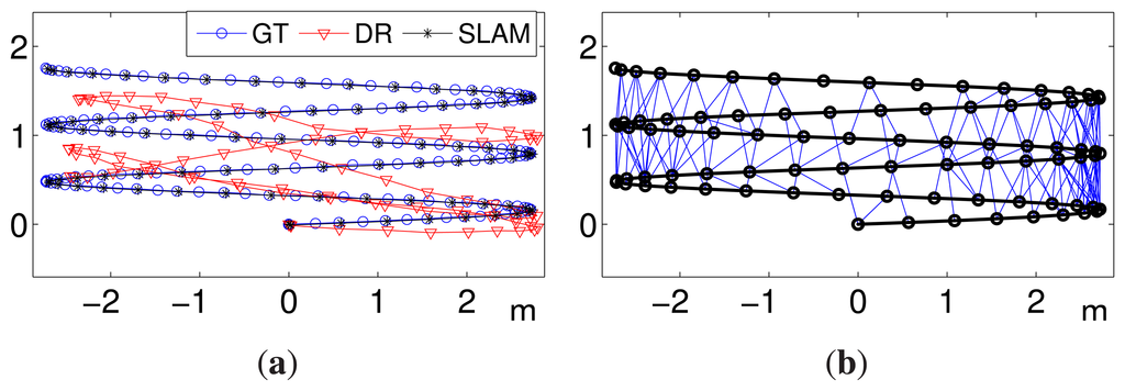 Furthermore, it is remarkable that the error covariances, which are shown as 2σ bounds in Figure 7, are small and significantly lower than those of dead reckoning. That is, even if very different dead reckoning trajectories are used, the SLAM results are very close to the ground truth.