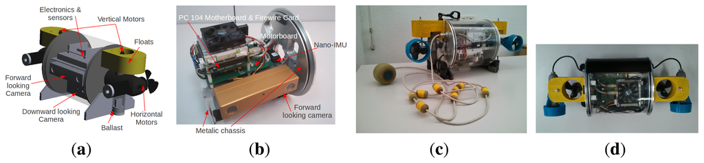 The literature is very scarce in this kind of compact system. Smith et al. [1] proposed a micro-AUV to perform inspection, hydrographic surveying and object identification in shallow waters. Watson et al. [2] detail the design of a micro-AUV specially designed to work in swarms, forming mobile underwater sensor networks for monitoring nuclear storage ponds. The hull of this micro-AUV consists of a hemisphere of 150 mm in diameter, and it contains several mini acoustic sensors, a pressure sensor, a gyroscope and a magnetic compass. Wick et al. presented in [3] a miniature AUV for minefield mapping. This robot can work alone or in groups to perform cooperative activities. The dimensions of this vehicle are 60 cm in length by 9 cm in diameter, and it is equipped with a compass, a gyroscope, an accelerometer and a pressure sensor. Both vehicles ([2,3]) have a limited data storage capacity and are mostly prepared to transmit the collected information to an external unit regularly.