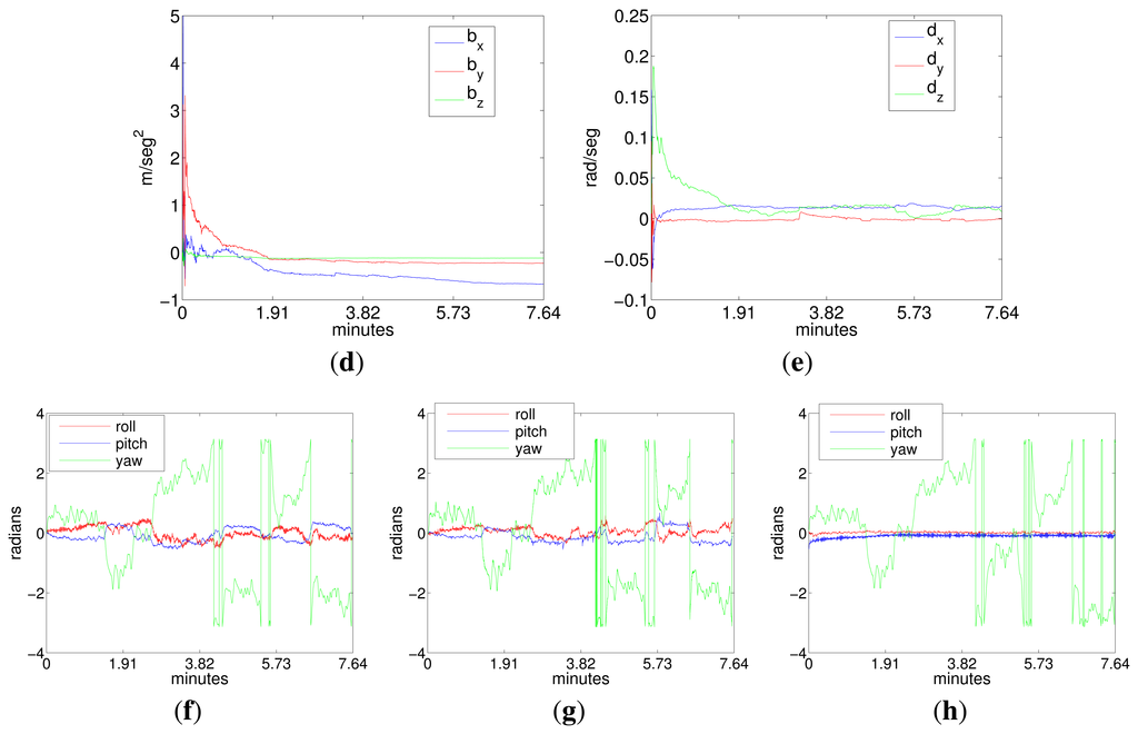 A complementary filter [16] could contribute to smoothing the orientation data given by the gyro and accelerometer, and the rest of the position/velocity variables could be taken from the aiding raw sensorial data. However, merging the data of multiple navigation sensors in an extended Kalman filter (EKF) goes one step beyond, since they take into account the motion (dynamic) model of the system, they correct the inertial estimates with external measurements and they consider the uncertainties of all of these variables. Furthermore, they are a widely-extended solution in autonomous robots [17]. Strategies based on Kalman filters also permit the continuous control of the vehicle despite the different frequencies at which the diverse sensors provide measurements and although, for example, any of those sensors may get temporally lost.