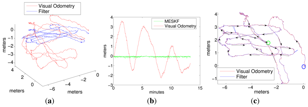 Figure 17a,b shows two different 3D views built during Experiment 4, registering the successive point clouds with the vehicle odometry pose estimates. Figure 17c,d shows two 3D views of the same environments, but registering the point clouds using the vehicle pose estimates provided by the MESKF. Again, in all figures, the starting point and the direction of motion are indicated with a red circle and a red arrow, respectively.