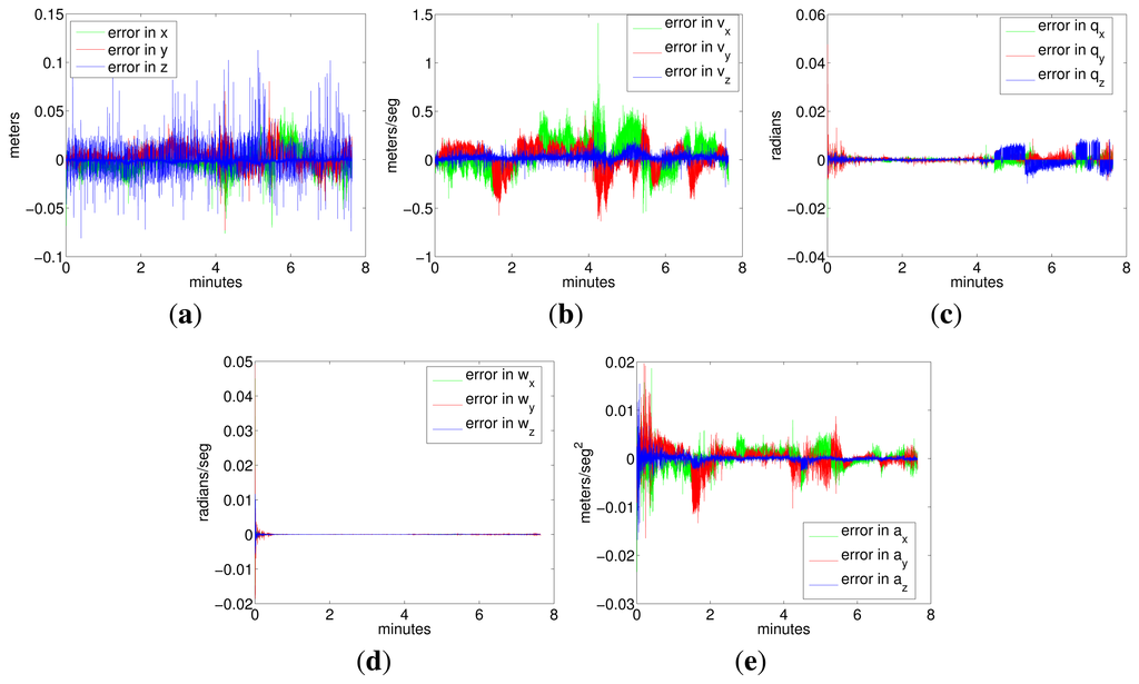 - Trawny, N.; Roumeliotis, S.I. Indirect Kalman filter for 3D attitude estimation; Technical Report 2005-002; University of Minnesota, Dept. of Comp. Sci. & Eng.: Minneapolis, Minnesota, EEUU, 2005. [Google Scholar]