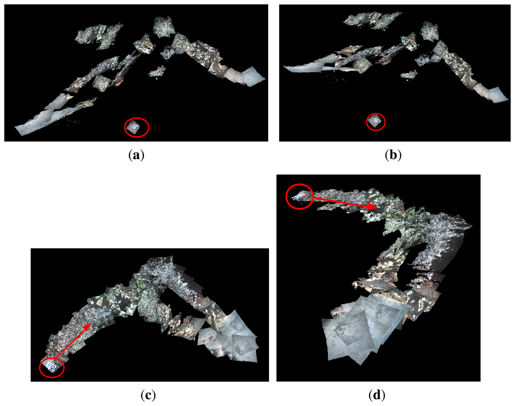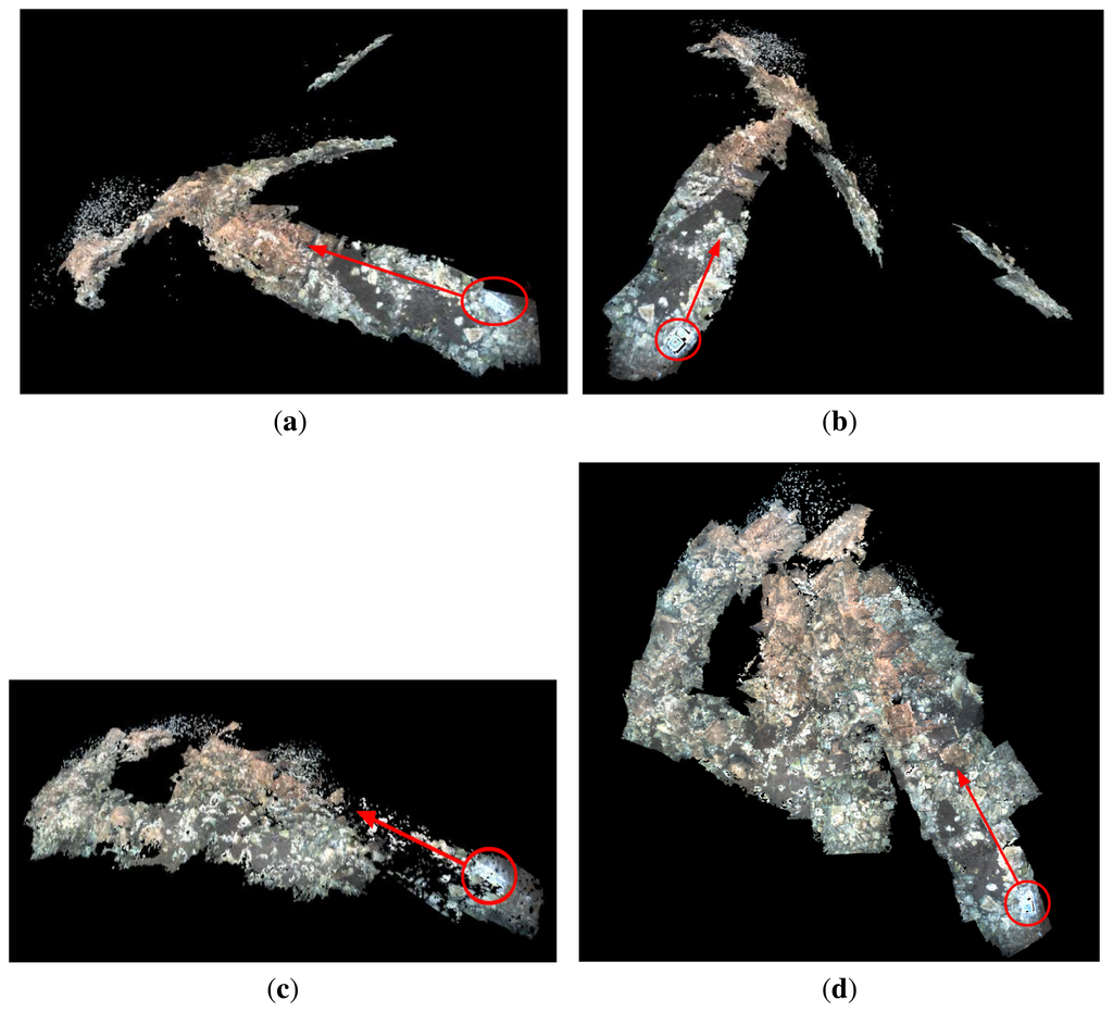 Figure 16a,b shows two different 3D views of the marine environment where Experiment 3 was performed. The successive point clouds were registered using the vehicle odometry pose estimates. Figure 16c,d shows two 3D views of the same environments, but registering the point clouds using the vehicle pose estimates provided by the MESKF. In all figures, the starting point and the direction of motion are indicated with a red circle and a red arrow, respectively. A marker was placed in the ground to indicate the starting/end point.