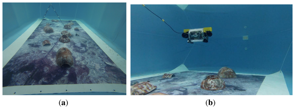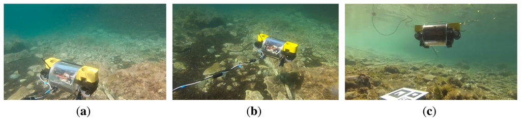 Figure 18 shows three images of Fugu-C navigating in this environment. In Figure 18c, the artificial marker deposited on the sea ground can be observed at the bottom of the image.