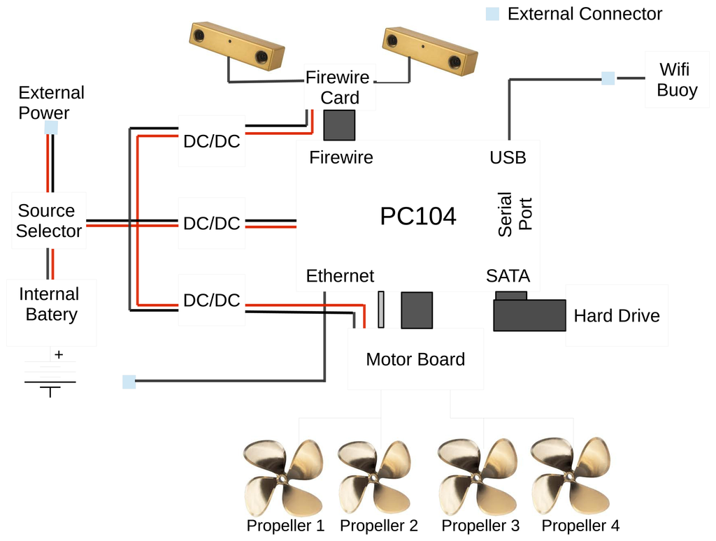 A 16-pin watertight socket provides the connectivity for wired Ethernet, external power, battery changing and a WiFi buoy. Note that not all connections are needed during an experiment. If the wired Ethernet is used (tethered ROV in use), then the buoy is not connected. Alternatively, if the buoy is connected (wireless ROV/AUV), then the wired Ethernet remains disconnected.