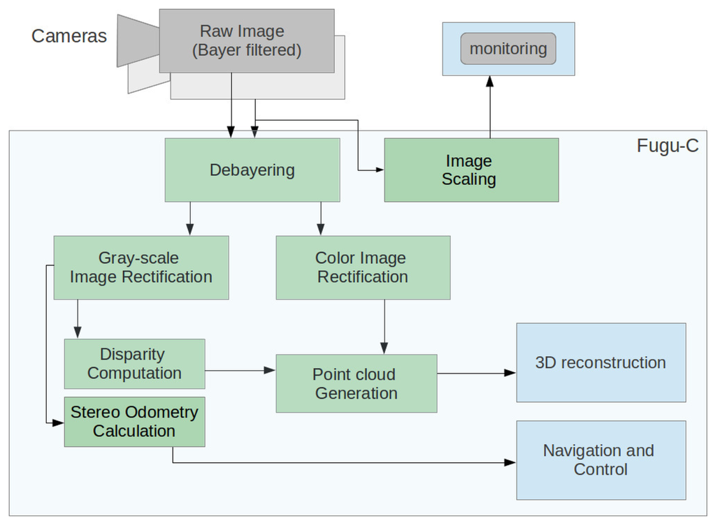 The visual functions include image grabbing, stereo odometry, 3D point cloud computation and environment reconstruction, which is explained in Section 3.