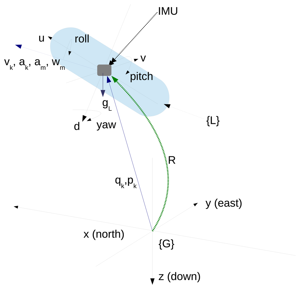 The error state formulation of Kalman filters (ESKFs), also called indirect Kalman filters, deal separately with nominal variables and their errors. Although the classical EKF formulation and an ESKF should lead to similar results, the later generates lower state covariance values, and variations on the error variables are much slower than changes on the nominal navigation data [18,19], being better represented as linear. Consequently, ESKFs are especially preferable, but not limited, for vehicles with six degrees of freedom (DOF) with fast dynamics, providing high stability in the navigation performance [20,21]. Besides, ESKF formulations permit continuous vehicle pose estimation, integrating the INS data, in case either the filter or all of the aiding sensors fail.